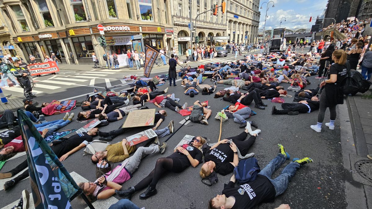 Rund 300 Aktivisten, die plötzlich wie tot auf dem Boden zusammensacken? Und das mitten auf einer Kreuzung vor McDonald’s unterhalb des Kölner Doms. Bei dem ein oder anderen Passanten kamen bei dem sogenannten „Die in“ Erinnerungen hoch: „Na hoffentlich kleben diese Veganer sich nicht auch noch auf der Straße fest“, entfuhr es einem. Das geschah nicht. Stattdessen sollte die Protestform auf das tägliche Töten von Tieren in der Industrie aufmerksam machen. Aktivistin Kira-Leticia Sprick wies darauf hin, dass während ihrer siebenminütigen Rede allein in Deutschland 10.000 Tiere in Schlachthäusern getötet würden.
