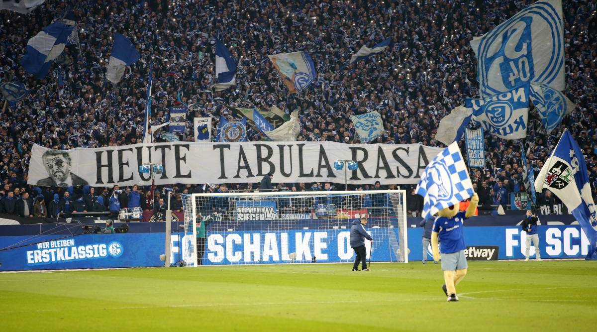 „Heute Tabula Rasa“, stand auf dem Banner der Ultras des FC Schalke 04. Zudem ist der NRW-Innenminister Reul mit einem blauen Auge gezeichnet worden. Wenige Minuten später zeigten die Fans noch ein Plakat: „Schalker sein heißt Probleme kriegen?“