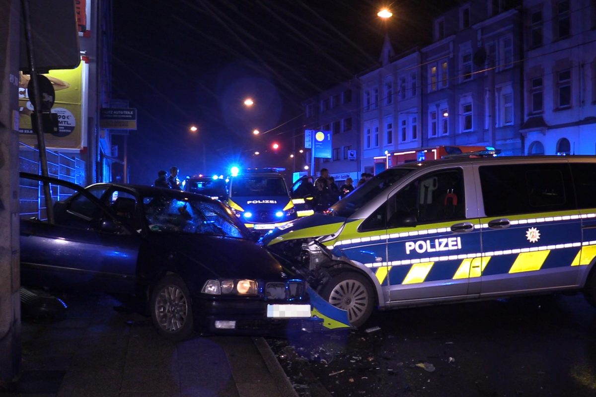 Plötzlich krachte es gewaltig auf der Altendorfer Straße in Essen! Ein BMW kollidierte mit einem Streifenwagen der Polizei. Das Ende einer Verfolgungsjagd, die kurz zuvor in Bottrop begann, und insgesamt fünf Verletzte forderte. Alle Infos hier.