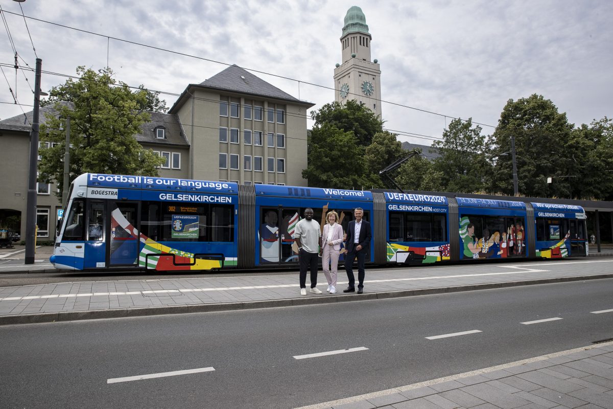 Neues Highlight in Gelsenkirchen. Auf den Schienen der Stadt ist jetzt eine Straßenbahn in ganz neuem Design unterwegs. Dabei handelt es sich um eine Bahn der Bogestra im Desgin der Europameisterschaft 2024. Damit will das Verkehrsunternehmen gemeinsam mit der Gastgeberstadt auf das Fußballturniert im eigenen Land einstimmen.