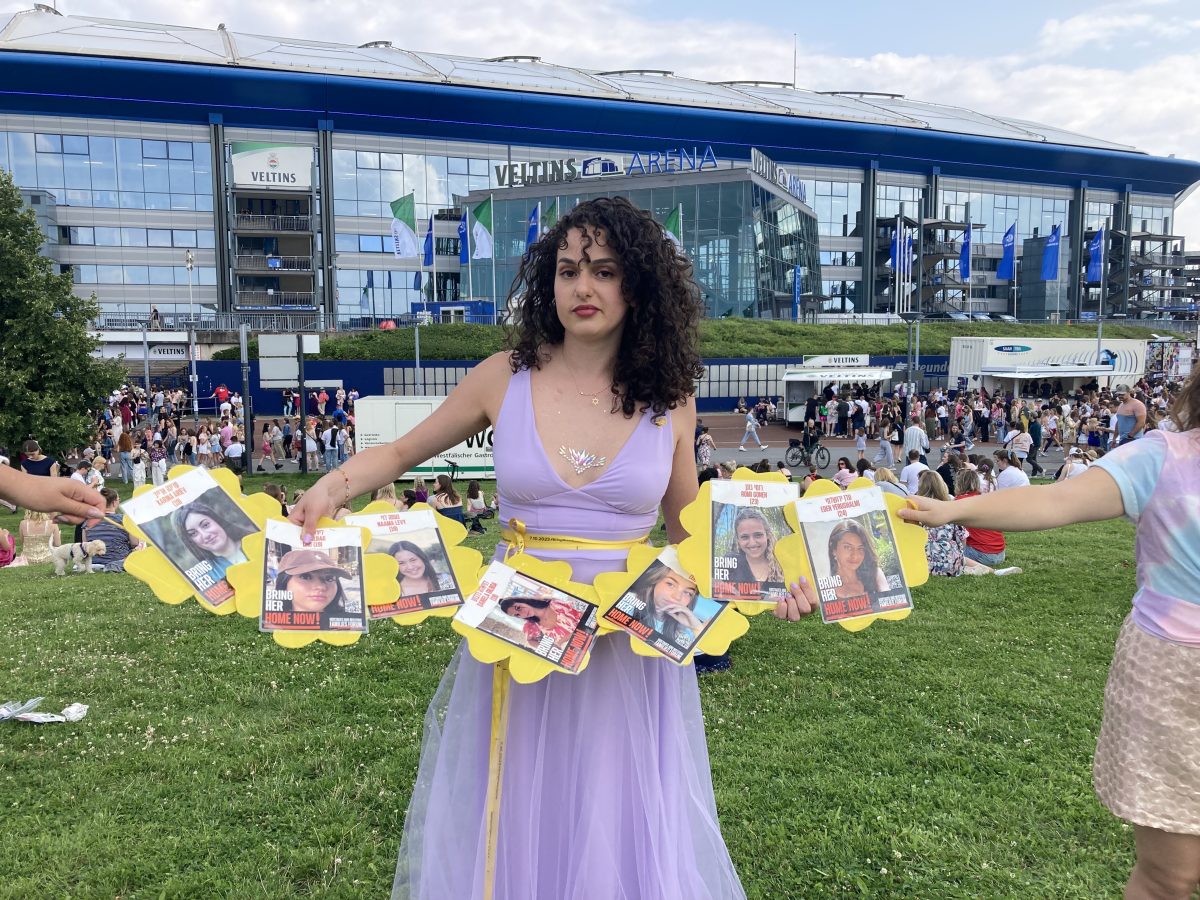 Danielle Tanzman (28) sieht in ihrem fliederfarbenen Kleid wie eine Märchenprinzessin aus. Angelehnt ist es an Taylor Swifts Märchenrobe, die sie bim Song „Enchanted“ vom Album Speak Now auf den Show-Bühnen dieser Welt trägt. So auch am Mittwochabend in Gelsenkirchen. Doch achtet man auf die Details ihres „Swiftie“-Outfits, so stechen gelbe Schleifen als Anstecker und als Gürtel ins Auge. Auf dem gelben Band um ihre Taille ist „7.10.2023 #Bringthemhome“ zu lesen.